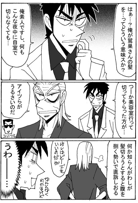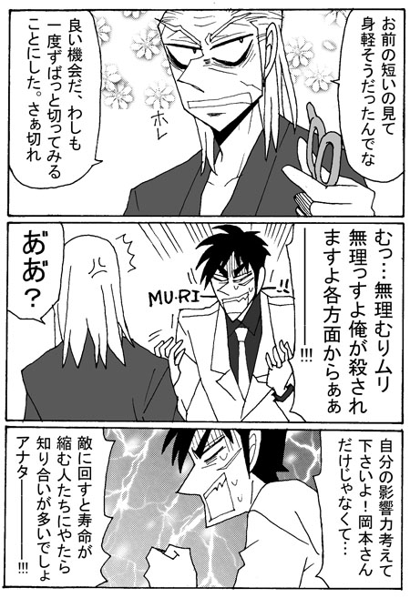 >というかカイジは上手く髪を切れるのか…?鷲巣様の御髪に粗相があったらと思うと